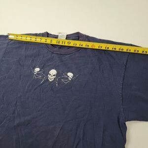 Express your punk rock side with this vintage Y2K Affliction Style Skulls Distressed Grunge Goth Punk Rock Tshirt. Featuring a graphic print of skulls, this blue cotton t-shirt is perfect for men who love music, bands, and retro fashion. The crew neck and short sleeves make it a comfortable fit for any occasion.
