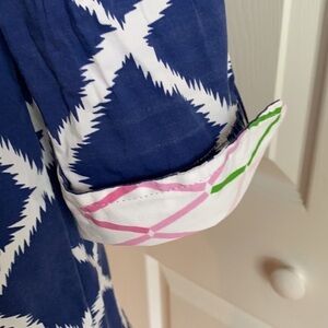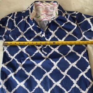 Tizzie Blue & White Tunic Top/Shirt Size Med Blue and white print Collar and sleeves have white/pink/green print underneath Slits on bottom sides Size Medium--see pics for approximate measurements EUC Tunic Top--Blue and white Tizzie