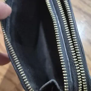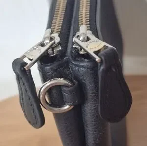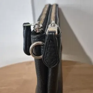 it features two zippered slip pockets and two card slots, plus a ring for attaching keychains and wrist straps