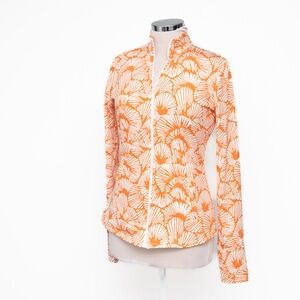 This lightweight Tommy Bahama Golf jacket features a full zip front and a stand collar, finished in a bold orange and white abstract shell print that feels very resort-meets-course. The fit is streamlined without feeling tight, making it easy to layer over a tank or polo. Designed for movement, the fabric has stretch and a smooth hand feel that works well for golf, travel, or casual active wear. The print gives it personality while still reading clean and sporty. Easy to throw on for early tee times or breezy afternoons. A fun, functional piece that stands out from basic golf layers.
