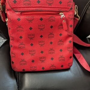 Elegant MCM shoulder bag in rich scarlet. Features iconic logo design.