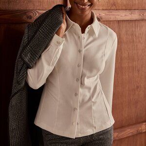 Easy fit, V-neck button front, long sleeves, hits at the knees