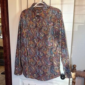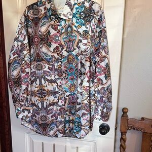 This beautiful flattering, bright and cheery Peter Nygard top in excellent condition. 21.5” pit to pit and 24” shoulder to hem. It’s soft and comfortable and so comfortable. Great for travel. Packs beautifully and arrives ready to go. Takes very little room in luggage. The color is bright and colorful and easily goes from dressy to casual with jeans.