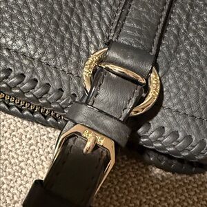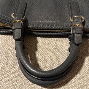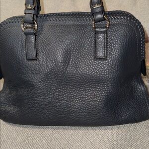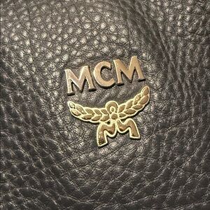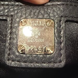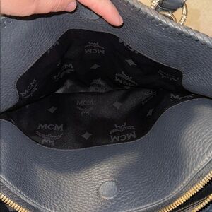 Chic MCM satchel in navy pebbled leather. Features silver logo and hardware. Perfect for stylish outings. This bag has a detachable shoulder strap. It is in good condition. Hardware overall looks nice. There may be some scratches because this bag has been used but overall still looks great. I do not see any markings on the exterior of the bag handles are in great condition. This bag has a center zip portion and then two pockets on the exterior sides overall clean magnetic closures work great on the exterior pocket areas. Zipper also works nice. Interior is also clean you do have the white tag inside the zipper pocket hardware plate still has the sticker on it. You have one zipper pocket and two slit pockets on the interior. This bag is absolutely stunning with the braided leather and is in amazing condition. Item comes from a smoke free home.