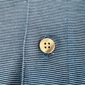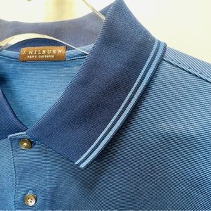 J. HILBURN Men’s Blue Polo Shirt Short Sleeve Custom Knit Polo Shirt. Ultra thin blue and light blue pin stripe polo shirt. With navy blue collar with 2 light blue thin stripes on hem of collar.