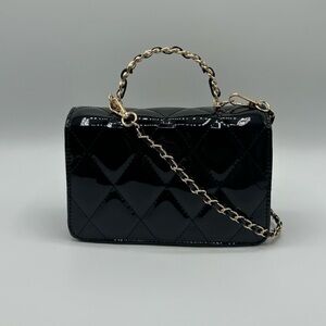 Chic black quilted mini bag. Features a stylish gold chain strap. Perfect for elegant outings.