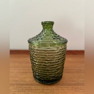 Vintage Anchor Hocking Soreno Avocado Green glass sugar bowl and creamer set. Manufactured by Anchor Hocking in the United States between 1966 and 1970.