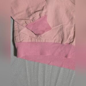 Vintage LA Seat Covers long sleeve shirt in a muted baby pink rough cotton fabric (almost canvas like). The darker pink is sweatshirt material. V neck with a chest pocket. Super funky vintage vibes with this one! I had never heard of the brand (chatpgt says brand is from the 80s) or seen a shirt like this before.