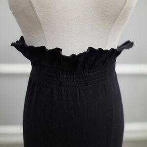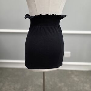 This chic black mini skirt features a playful ruffled waistband, adding a touch of flair to your outfit. Perfect for any occasion.