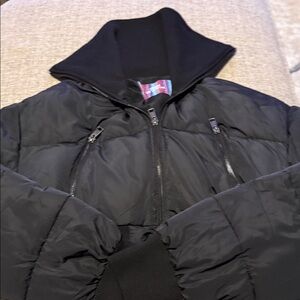 Sleek black puffer with a cropped fit. Features a high collar and zippered pockets. Ideal for layering.
