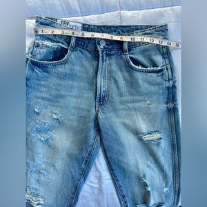 These ZARA TRF IX’D Makers Light Wash Destroyed Jeans deliver that effortless, laid‑back look with a super flattering fit. They feature a high‑rise waist, stone‑washed distressed denim, and a raw split hem flare that gives a subtle, stylish kick at the bottom. Perfect for anyone who loves a relaxed yet elevated denim vibe.