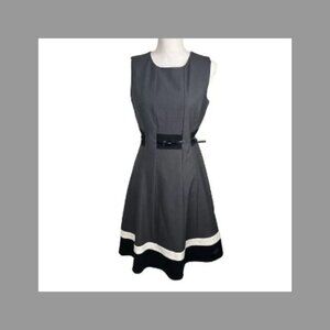Calvin Klein Gray Black Fit Flare Belted Classic Office Dress Women’s