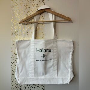Large white canvas tote bag with green HALARA logo. The sides are narrow at the top and get bigger along the bottom for a wider base. Ideal for daily use.
