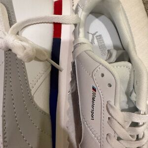 Sleek white shoes with Puma Motorsport logo. Ideal for everyday style.