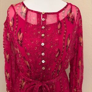 Chic red dress with intricate patterns. Features buttoned front and waist tie. Ideal for elegant events.
