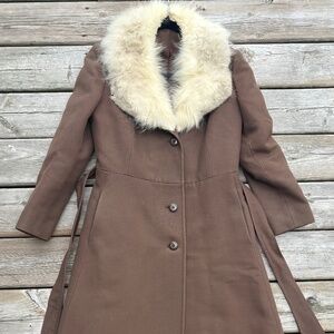 Vintage 60s Wool Coat w/ Fur Collar Pure Virgin Wool Belted Brown Long Coat Anna Collection – Small