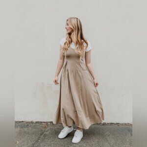 A staple for warm weather, this pretty midi dress features an A-line silhouette with a fitted, V-neck bodice and a pleated skirt with buttoned envelope pockets at the hips.
