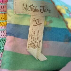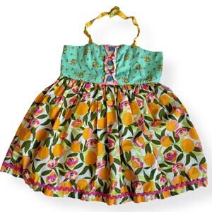 Size 12 Matilda Jane, You're a Peach tunic from the Brilliant Daydream line. Super cute mixed prints, floral, peaches fruit, stripes, ric-rac and more. Halted top with adjustable strap. Play condition for stains across the front and back. See close up photos.