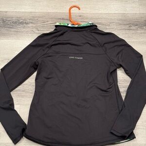 Super cute zip-up jacket from Love Fitness Apparel. Material is super buttery, stretchy, and sweat-wicking. Black on the outside, with palm leaves, plumaria flowers, and pineapples on the inner lining. Plenty of pockets, and the best part about it.. the thumbholes! Size is large, but the fit is snug, although the fabric is stretchy. I’m usually a medium in tops, and this fits me slightly loosely. Packed and shipped with care from a smoke-free home. Interested? Make me an offer! :)