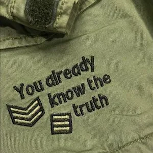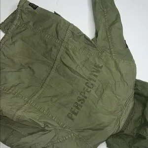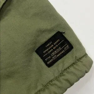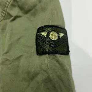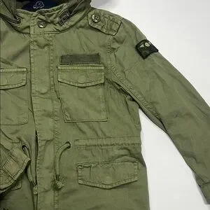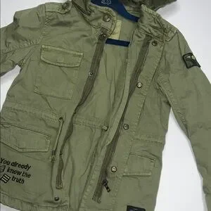 Stylish olive green jacket with hood. Features multiple pockets and patch details. Perfect for cool weather.