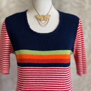 Description: vintage 90s or older, navy, red, white, green, and orange striped vintage short sleeve shirt by NAULOVER (Spanish Luxury Brand founded in 1957) in US women’s size S.
