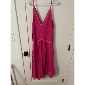 Keywords: Esteban Cortazar dress, pink dress, V-neck dress, linen dress, ruffle hem dress, sleeveless dress, summer dress, bohemian dress, casual dress, party dress, designer dress, size XL dress