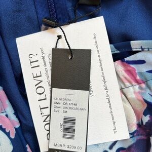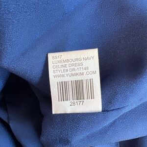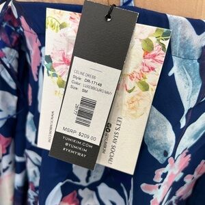 This YUMI KIM Celine dress in navy blue features a beautiful floral pattern and off-the-shoulder sleeves, making it perfect for a party or casual occasion. The dress is made of 100% polyester chiffon and has a zip closure.