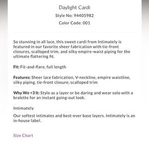 Free People Intimately Daylight Lace Cardi in Black Brand new without tags $58 MSRP Size XS, S, M Line through label to prevent store return- no flaws otherwise So stunning in all lace, this sweet cardi from Intimately is featured in our favorite sheer fabrication with tie-front closures, scalloped trim, and silky empire-waist piping for the ultimate flattering fit. Fit: Fit-and-flare, full length Features: Sheer lace fabrication, V-neckline, empire waistline, silky piping, tie-front closure, scalloped trim Why We <3 It: Style as a layer or be daring and wear solo with a bralette for an instant going-out look.