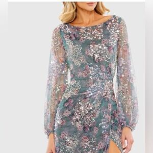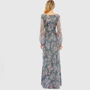 MAC DUGGAL Gray Embellished Illusion Long Sleeve Faux Wrap Gown NEW