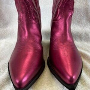 Steve Madden leather western boots in a hot pink metallic leather upper with a western heel and pointed toe and marching lining in hot pink. These are super cute - can't you see these peeking out from under a pair of jeans or stealing the show with a mini skirt or midi dress? Heel measures appx 3" and the shaft, measured from bottom of heel to highest point of boot - is about 15-1/4". Pull on style with tabs on each side of the beautifully embossed leather. There is a very tiny discoloration on the inside of the left boot that is not noticable but there nonetheless at the 7-1/2" marker of the tape measure. Probably cannot see on the picture (it is that small) but I did not try to remove it. Never been worn. NWOT No box