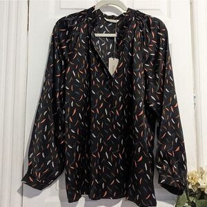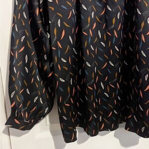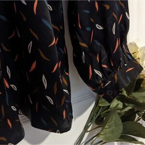 Long sleeve pullover blouse in black and multicolored abstract motif. Features notched standup collar with v neckline, buttoned cuffs with gathering detail, and straight hemline.
