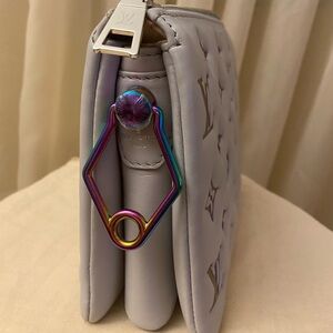 Elevate your style with this Louis Vuitton bag featuring a chic gray design and an eye-catching iridescent chain. Perfect for any occasion.