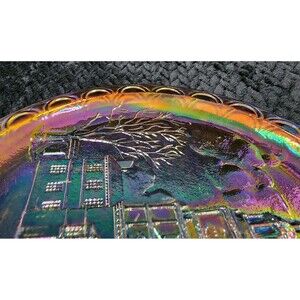 Celebrate America’s history with this striking vintage Indiana Glass carnival glass plate, issued in 1976 to commemorate the Bicentennial. The plate features Independence Hall in crisp detail with vibrant marigold iridescence. A perfect piece for collectors of patriotic glassware or Mid-Century Americana. Collect now before the Sesquicentennial in 2026!