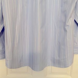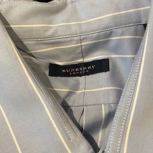 Burberry very pale blue with white striped shirt which is the perfect closet staple. Shirt is a size 17L. Approximate measurements laying flat are as follows: armpit to armpit - 25"; waist - 24.5"; bottom of shirt - 26.5"; length - 35". Pristine condition.