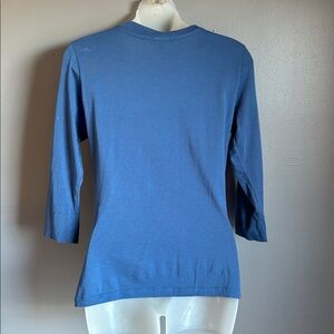 Stylish (faux) wrap top with 3/4 sleeves. Pretty blue color. Lightweight. Sz med. EUC. Please see photos for more details and measurements.