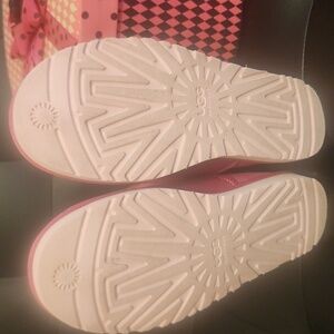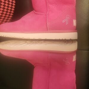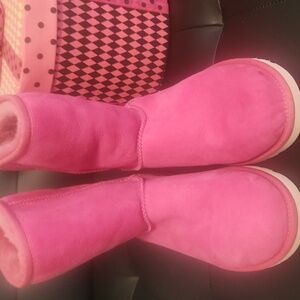 Vibrant pink UGG boots with cozy shearling lining. Stylish and warm. Small spot on the front one pair, minor rubbing on the side of the other one (shown in pictures) Please refer to ALL pictures before purchasing.