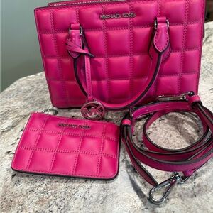 MICHAEL Kors small Sheila satchel with matching cardholder used once in new condition COLOR IS DRAGONFRUIT signature logo charm and sleek design.