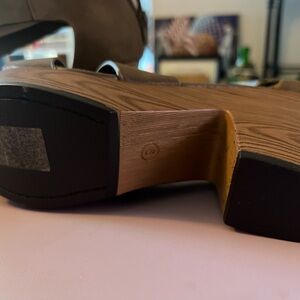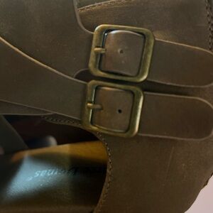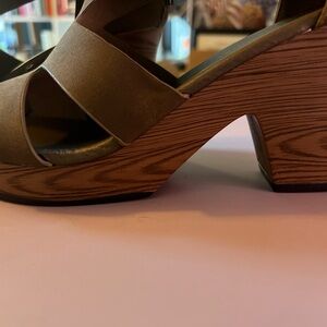 Stylish tan wedges with strappy design. Features buckle accents. Perfect for versatile wear.