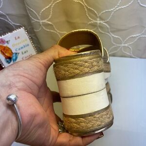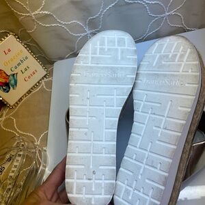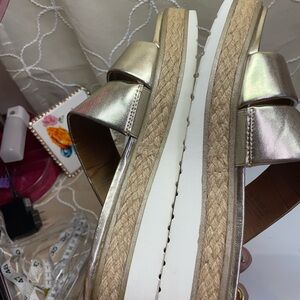 (P3) Franco Sarto gold leather platform sandals, women's size 8, used in perfect condition. See photo for more details.