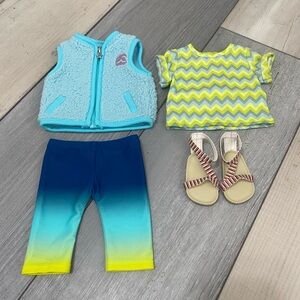 American Girl Corinne Tan Camping Outfit. Complete set includes shirt, legging, vest, and sandals. No box but in excellent condition. Well cared for in smoke-free home.