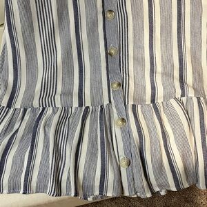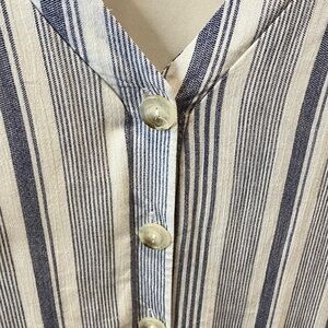 Chic V-neck top with blue and white stripes. Button-up front. Perfect for casual wear.