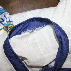 100% official licensed NEWCASTLE RIVERKINGS jersey. Manufactured by SHINE DOG ICE GEAR. Size label cut, so I personally measured 22" from armpit to armpit across the chest at the widest part and 28" from top of shoulder to hem. That's like, in between an Adult S and M for me. Made in U.K. original. No time for Far East fakes or modern reproduction bollocks. This is the real deal.