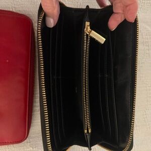 Elegant Tory Burch wallets in vibrant red and classic black. Features signature logo accents.