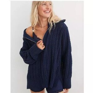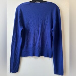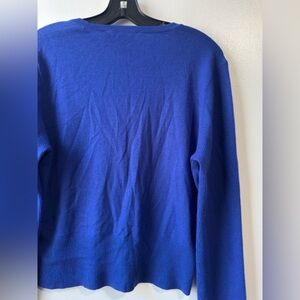 Elegant deep blue cardigan with V-neck. Features button-up front. Perfect for layering.