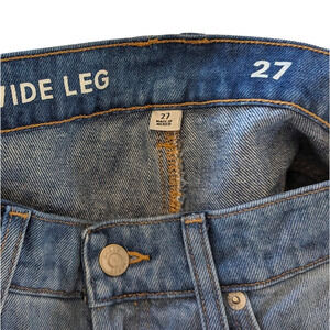 Pre-owned women's J. Crew slim wide leg high rise two tone medium indigo patchwork wash jeans with raw hem.