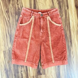 Chic corduroy shorts in a rusty orange color with contrast cream stitching.