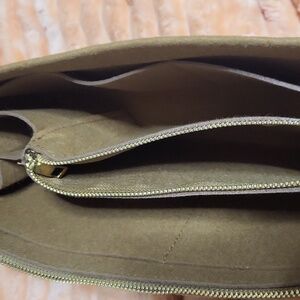 Stylish brown felt organizer with gold zippers. Perfect for keeping items organized. has a double zipper