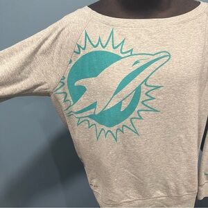 Women’s Nike Dri-fit off shoulder wide neck Miami Dolphins NFL Football long sleeved shirt XL. There is a small bleach stain near the bottom hem. Please see pics for full details. Otherwise in great condition.