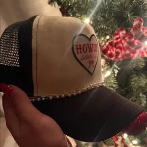 Stylish trucker hat with 'Howdy Sweetie' embroidery. Cream front with black mesh back. Gold bead detail adds charm.