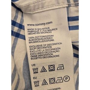 This Tommy Hilfiger Men's Size Large Blue/White Button Up Shirt is a versatile and stylish addition to any man's wardrobe. Made from cotton with a plaid pattern, this shirt features short sleeves, a collared neckline, and button closure. Perfect for travel, casual, or business occasions, this lightweight and easy-care shirt is suitable for all seasons and has a regular fit. With a classic blue and white color scheme and a button-down collar style, this shirt is a timeless and colorful piece that can be machine washed for added convenience.